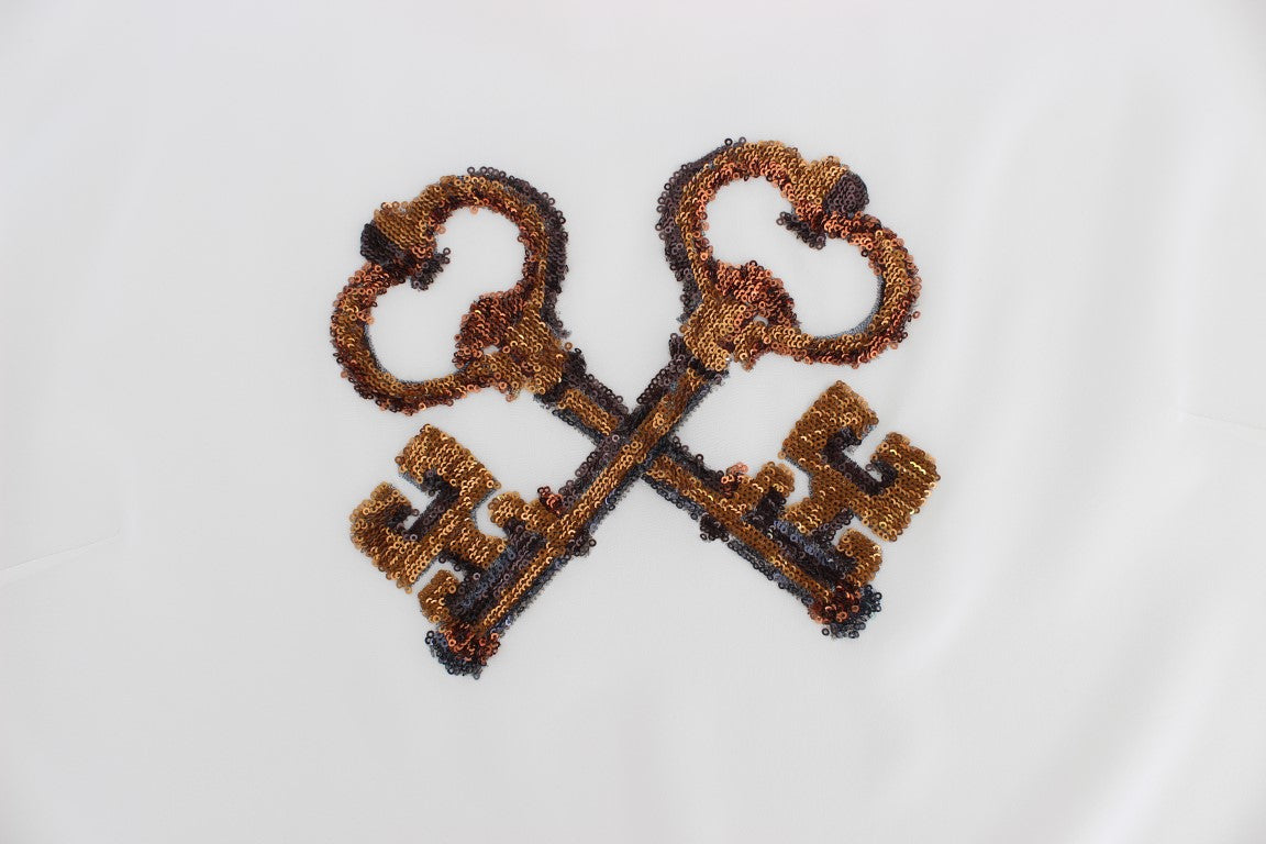 White Sequined Key Silk Blouse T-shirt Top